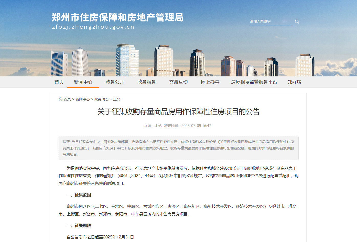 為貫徹落實(shí)黨中央、國務(wù)院決策部署,推動房地產(chǎn)市場平穩(wěn)健康發(fā)展,依據(jù)住房和城鄉(xiāng)建設(shè)部《關(guān)于做好收購已建成存量商品房用作保障性住房有關(guān)工作的通知》(建保〔2024〕44號)以及鄭州市相關(guān)政策規(guī)定,收購存量商品房用作保障性住房進(jìn)行配售或配租,現(xiàn)面向鄭州市征集符合條件的房源項(xiàng)目。